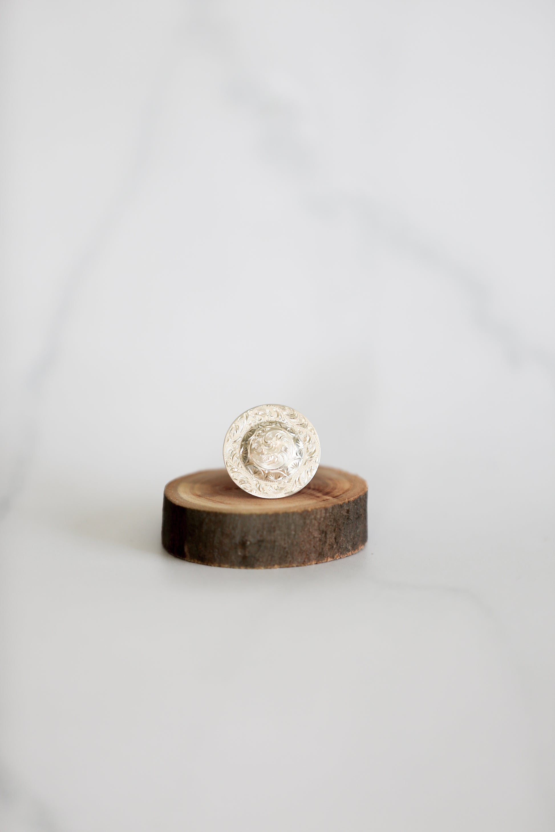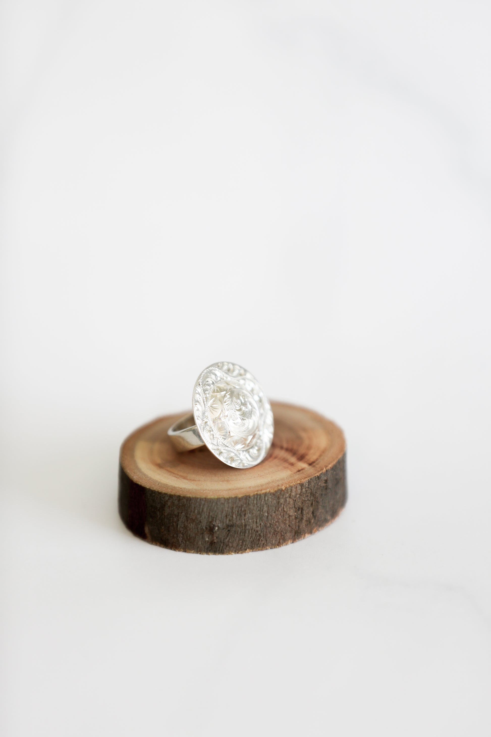 Versatile as a ring or scarf slide, this concho is meticulously crafted and engraved from sterling silver (stamped 925), showcasing a perfect fusion of artistry and refinement.